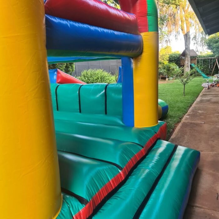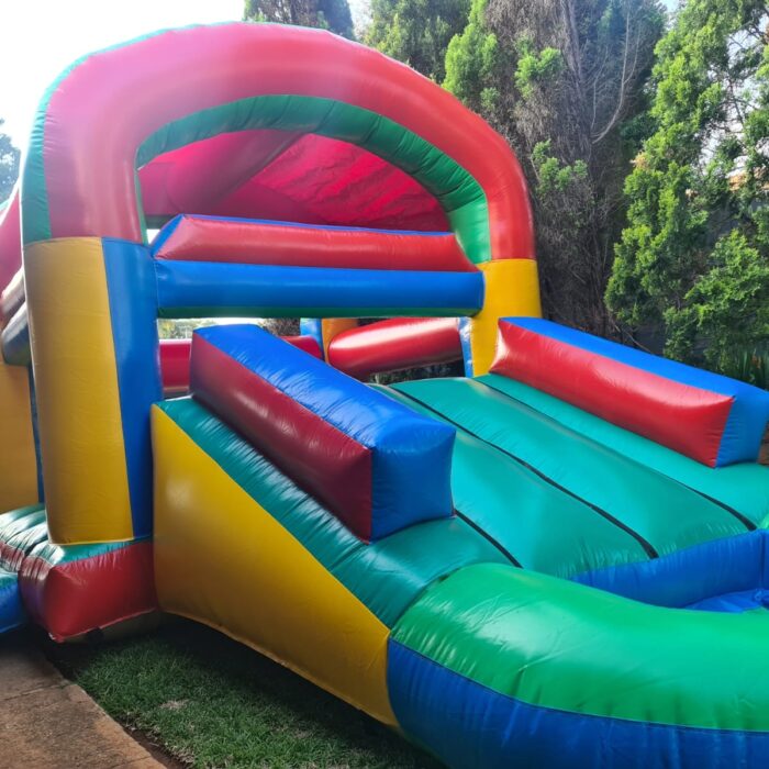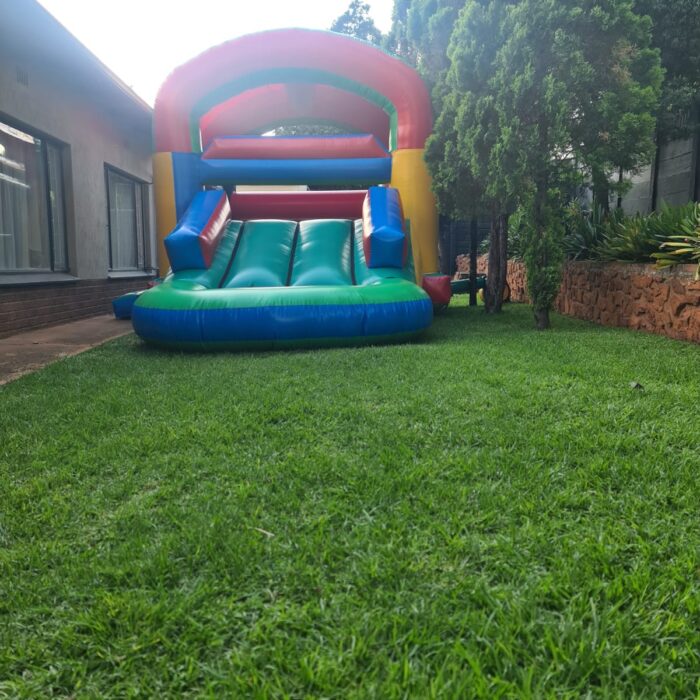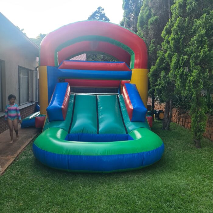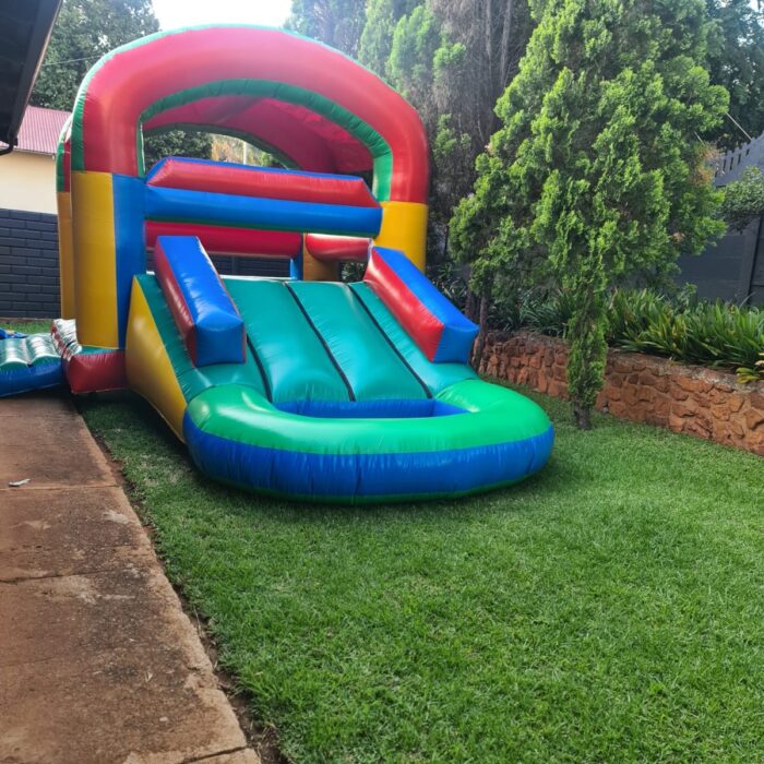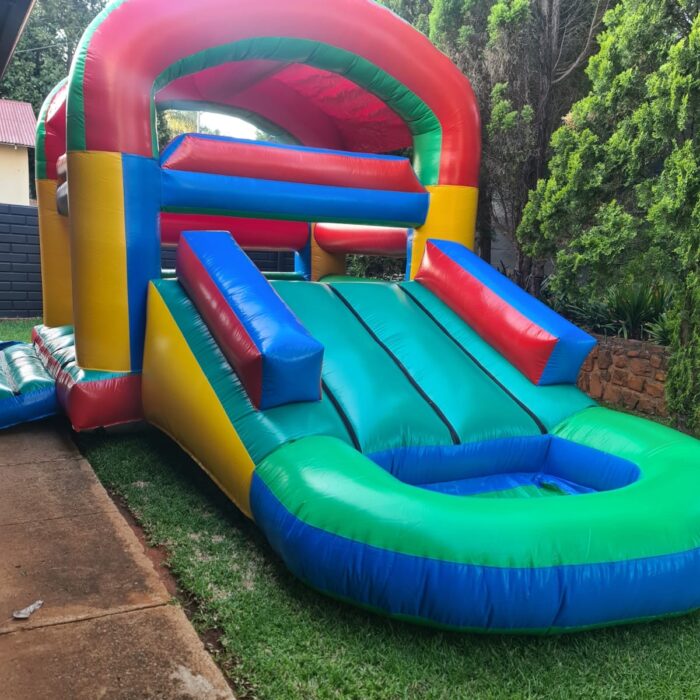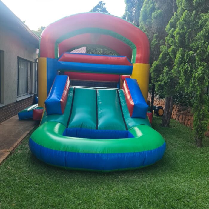 This castle features a jumping space covered by a nice roof to protect the kids from the sun as well as a slide and a water pool. Great for hot summer days. This castle is spacious and colourful for all children to enjoy.